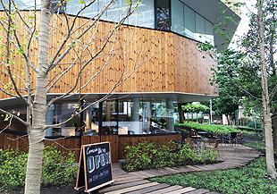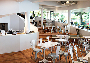 猿楽古代住居跡公園に面した、緑の中の12角形の建物 THE SOHO CORNER D.K.Yにある「モンキーカフェ」。ハンドドリップで一杯ずつ丁寧にいれたコーヒーと、併設するモンキーギャラリーでのさまざまなワークショップやアートイベントがお楽しみいただける空間です。